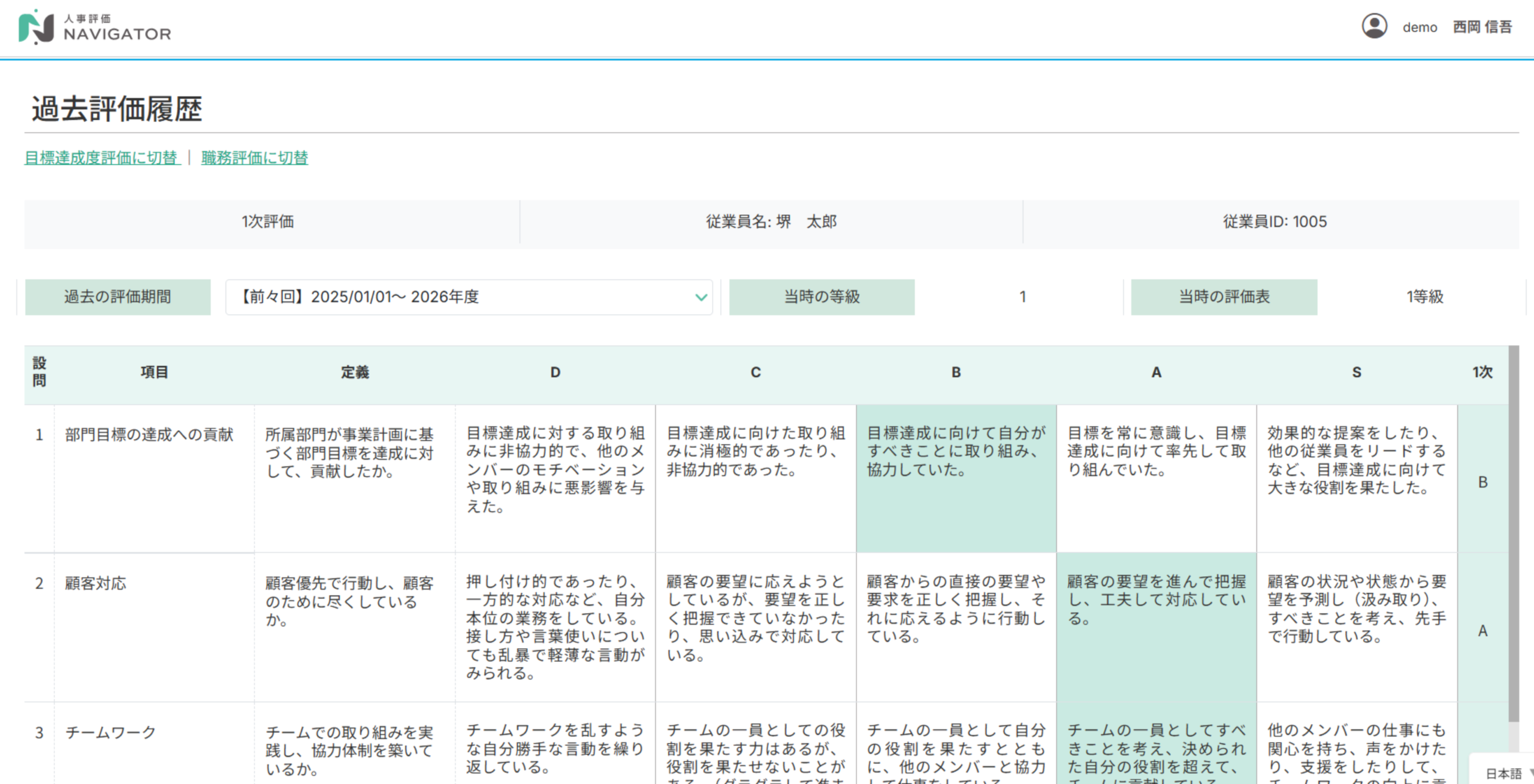 人事評価ナビゲーターでは、以下のような画面で過去の評価履歴を確認できます。