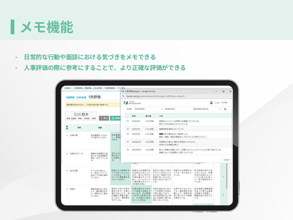 メモ機能を使うことで、何か感じた際に都度メモをし、それを見返して定性評価を行うよう指導しており、公平な評価に繋がるようになった。